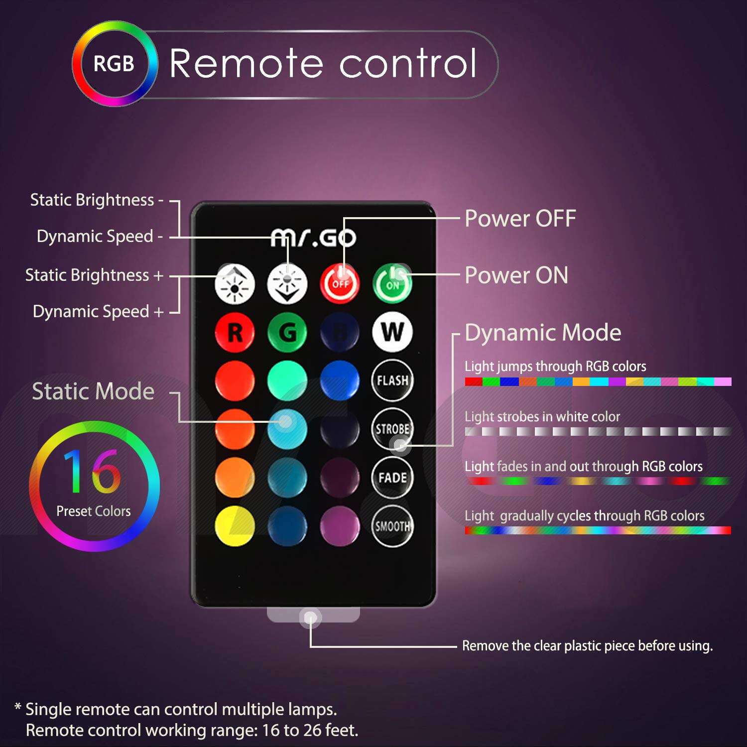 Features 16 fixed RGB colors + 4 dynamic color-changing modes (FLASH, STROBE, FADE, SMOOTH).