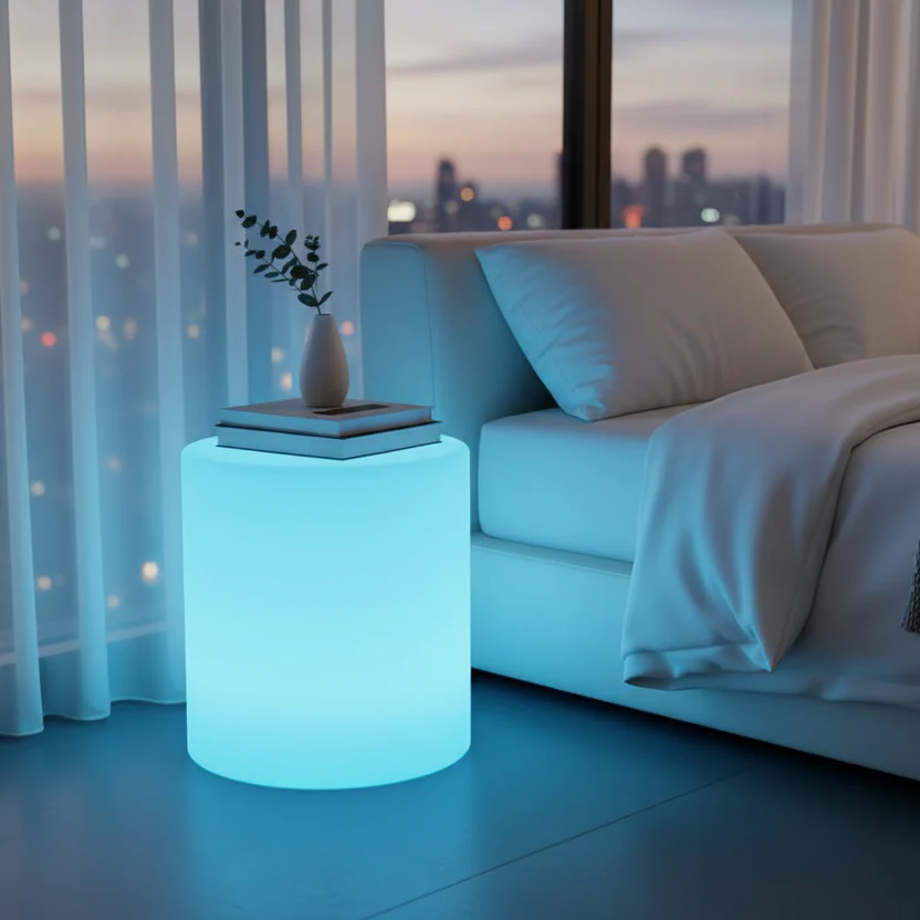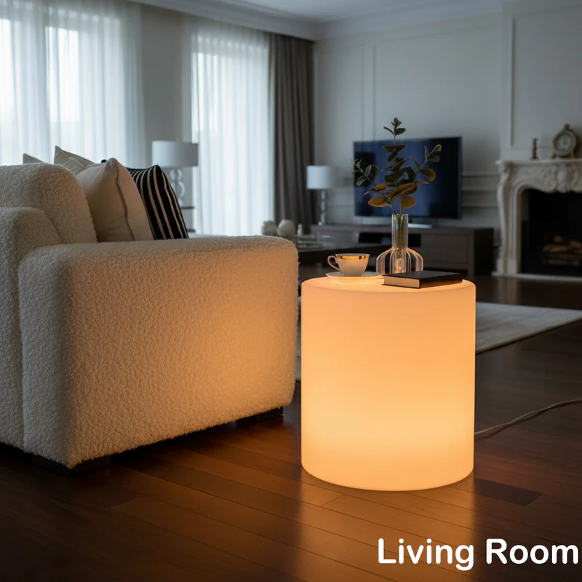This is a set of LED cylindrical table and stool combinations suitable for indoor and outdoor leisure scenes, made of PE material and equipped with IP65 waterproof LED wicks. The table and chair support independent RGB full-color dimming, and can switch between various light effect modes such as gradient and breathing. At the same time, they are equipped with a charging/plug-in dual power supply solution, and the single device can last for more than 10 hours. The streamlined integrated design combines design and practicality, with a scratch resistant and spill resistant surface that is suitable for placing drinks and meals. It not only meets the needs of leisure use, but also serves as a spatial atmosphere device to enhance the texture of the scene.