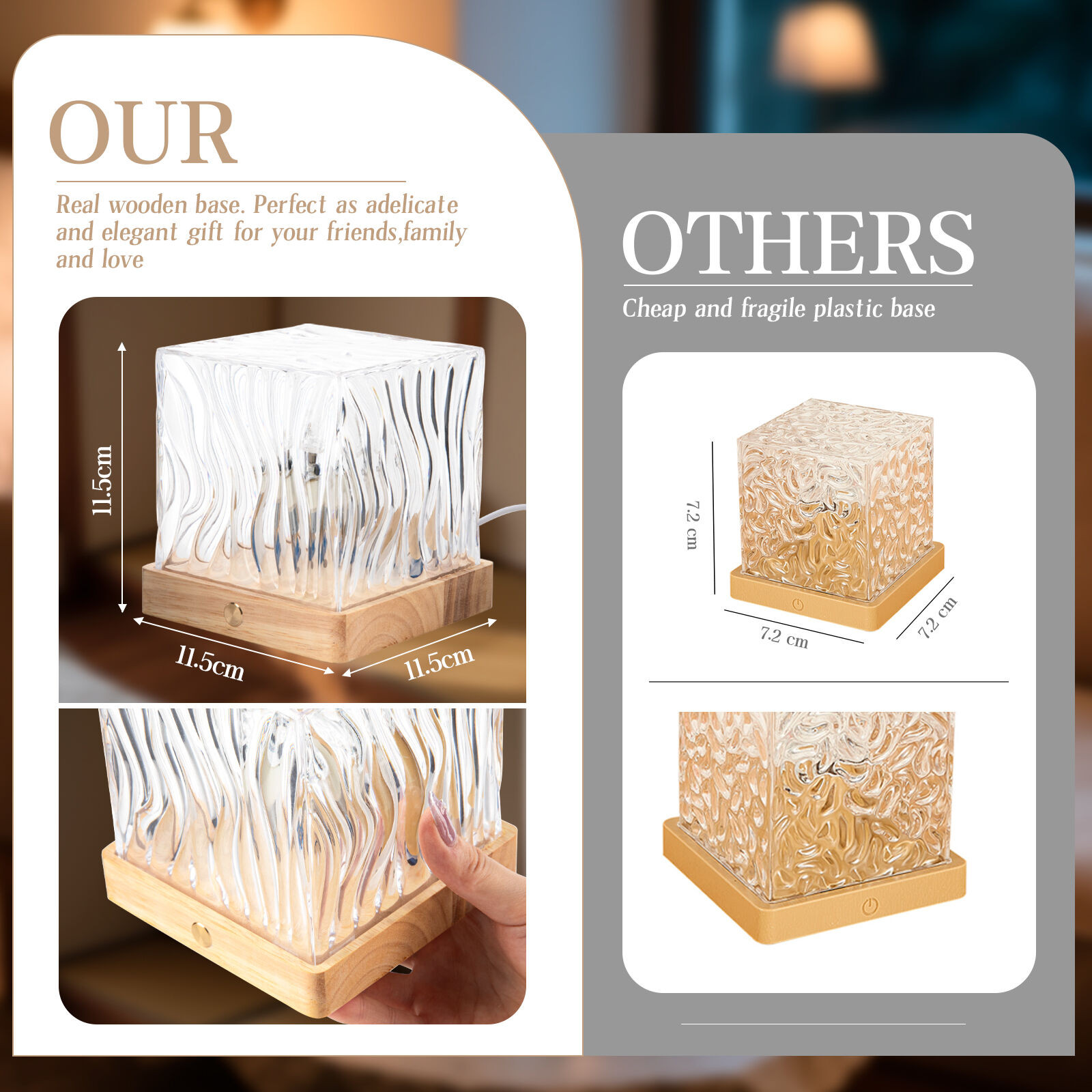 feels sturdy when placed on nightstands or coffee tables. Many buyers choose the Wood Base as a housewarming gift—its texture instantly