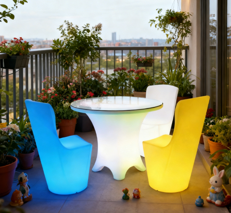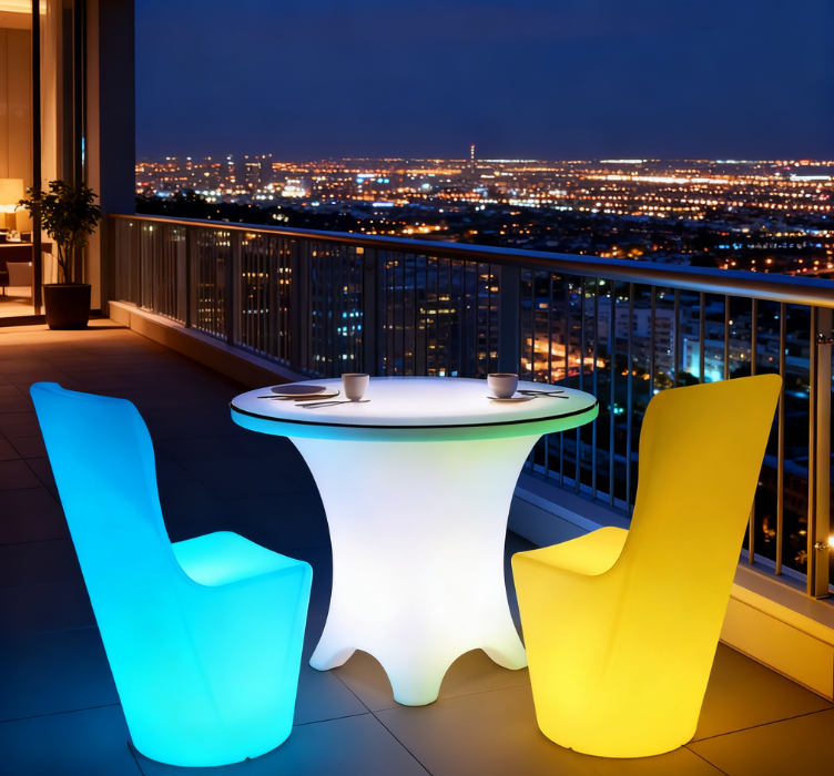 This is a set of LED illuminated table and chair combinations suitable for indoor and outdoor leisure scenes, including 1 circular LED table and 2 streamlined LED chairs, both made of PE material and equipped with IP65 waterproof LED wicks. The table and chair support independent RGB full-color dimming, and can switch between various light effect modes such as gradient and breathing. At the same time, they are equipped with a charging/plug-in dual power supply solution, and the single device can last for more than 10 hours. The streamlined integrated design combines design and practicality, with a scratch resistant and spill resistant surface that is suitable for placing drinks and meals. It not only meets the needs of leisure use, but also serves as a spatial atmosphere device to enhance the texture of the scene.