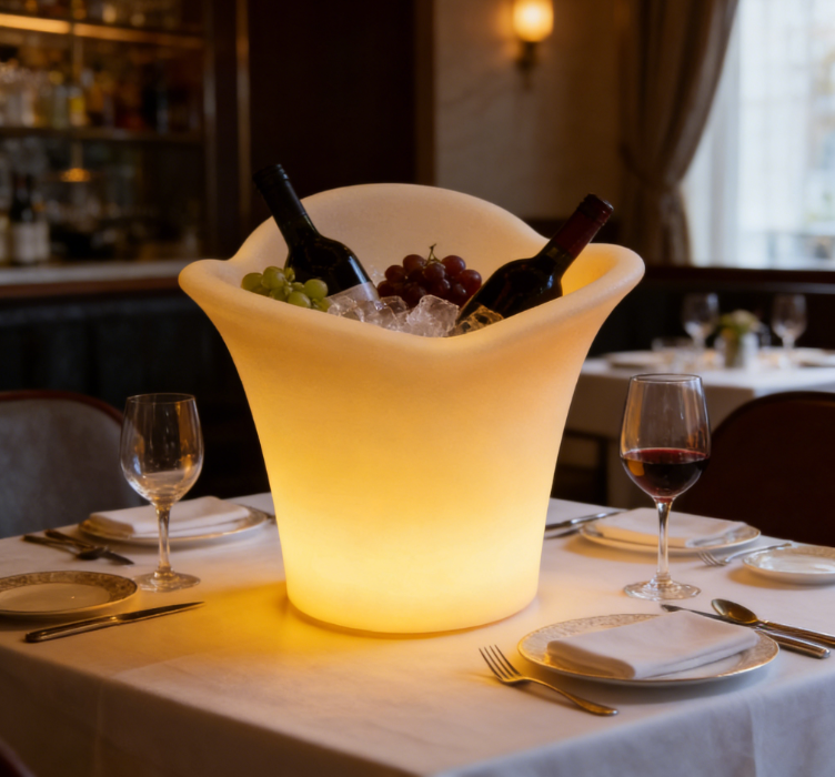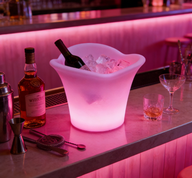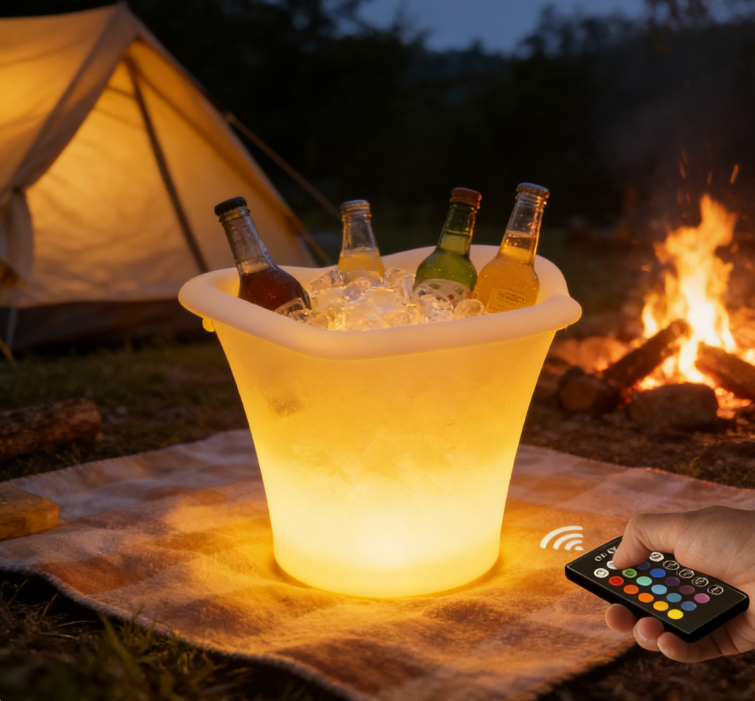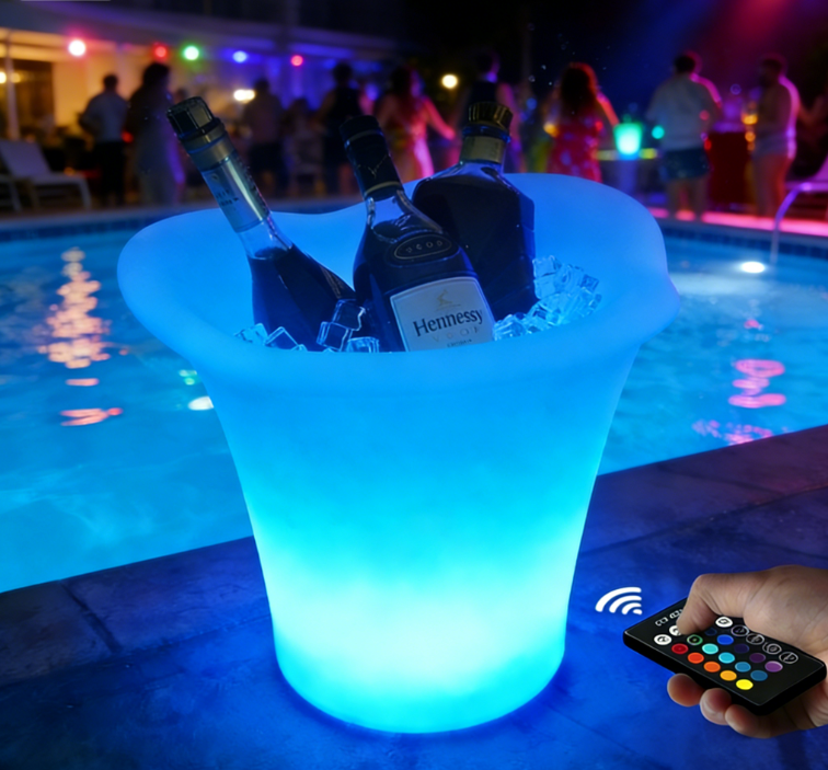 The multi colored LED three flap ice bucket can hold wine bottles, cans, or champagne bottles. IP68 durable, waterproof, portable color changing LED lights enhance the atmosphere on site and can be used for swimming pool terraces and decks. Very suitable for indoor and outdoor bars, celebrations, barbecues, picnics, all parties or events.