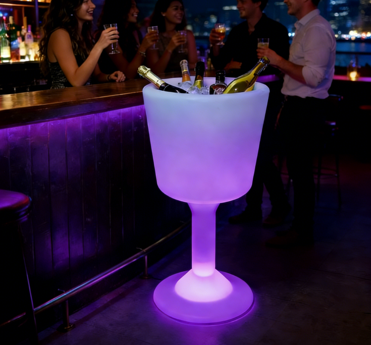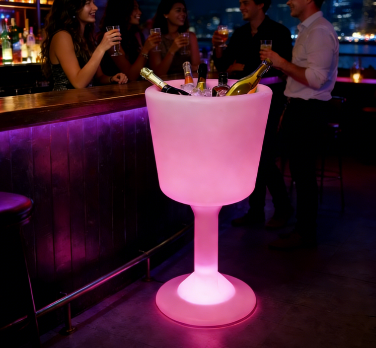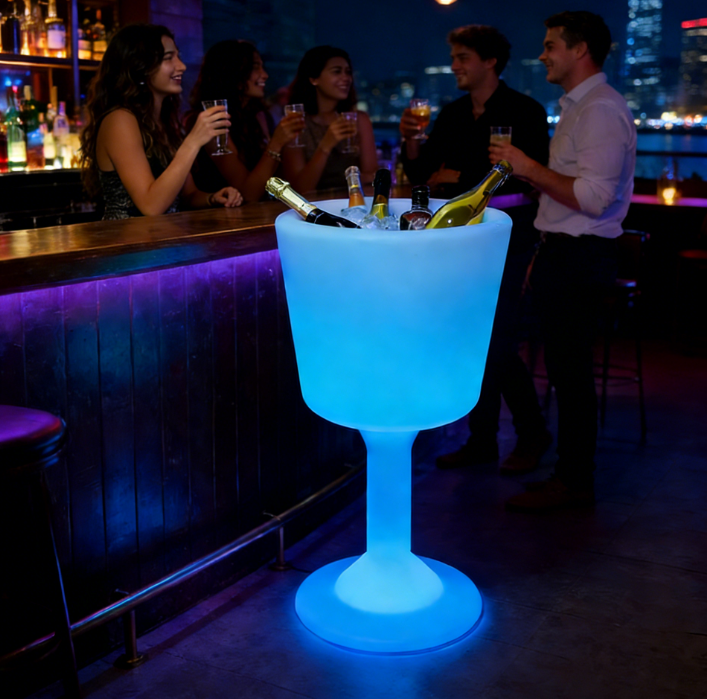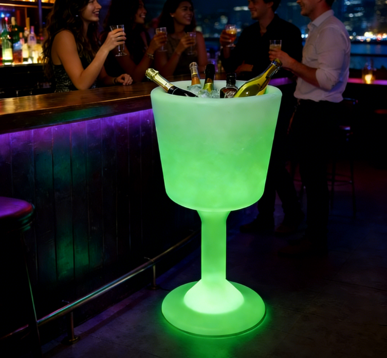 Színes asztali lámpa formájú LED pezsgős jégtartó, amely borospalackokat, dobozos italokat vagy pezsgős üvegeket is tartalmazhat. Tartós, vízálló és hordozható, színváltó LED-fény. Minden alkalmat ünnepélyesebbé tesz. Ez a világító LED-es medenceparti, teraszos jégtartó ideális beltéri és kültéri bárokhoz, ünnepekhez, barbekükhöz, piknikekhez, valamennyi partira vagy rendezvényre.