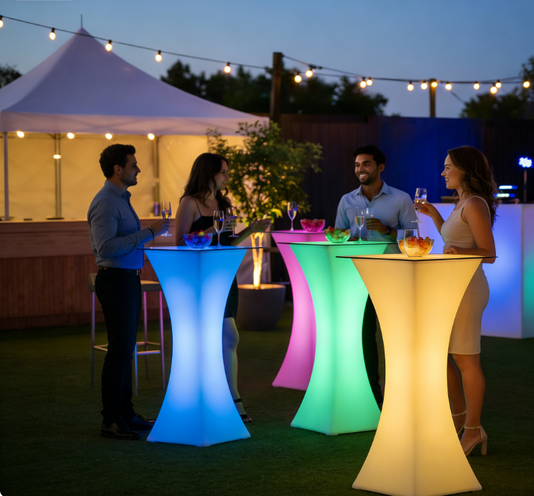 • Party/Bar: Serve as a high table for drinks and highlight the lively atmosphere with colorful lights