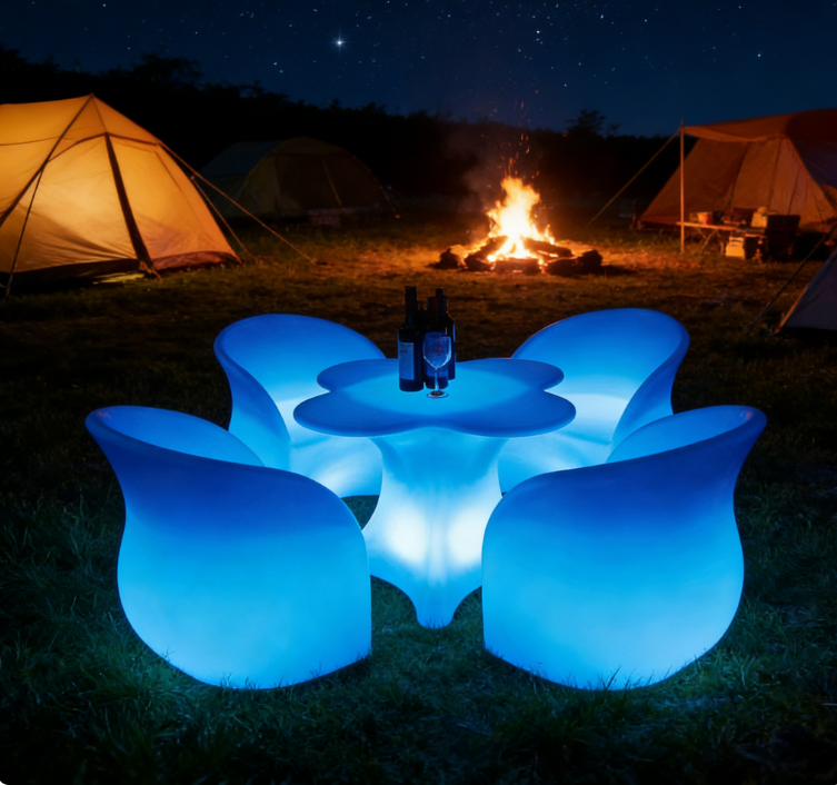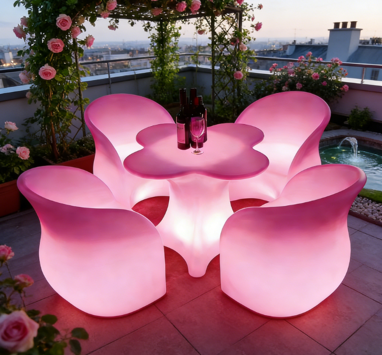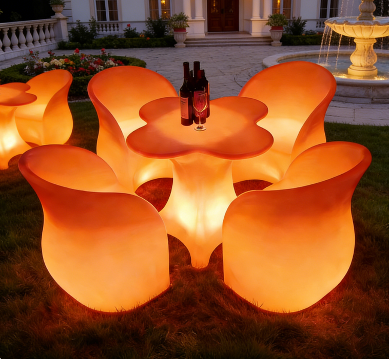 This is an LED illuminated table and chair combination inspired by the plum blossom outline design. It is made of environmentally friendly translucent materials with frosted texture, and the lighting is soft and not dazzling. It not only has practical furniture functions, but also serves as an atmosphere decoration, making it the finishing touch of scene creation