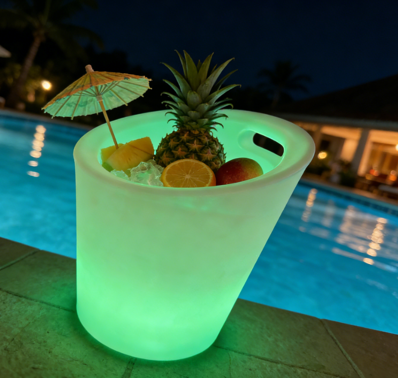 As a hot selling item for outdoor leisure and party scenes, this 27cm diameter x 30cm high LED ice bucket, with its core configuration of IP68 full waterproof, 10 meter remote light control, and large capacity cooling, is perfectly suitable for various scenarios such as European and American family parties, yacht gatherings, bar booths, etc. It is not only a long-term cold locking wine storage container, but also a 16 color dazzling atmosphere creation artifact, making it a cost-effective choice to enhance listing conversion.
