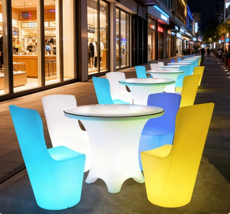 This is a set of LED illuminated table and chair combinations suitable for indoor and outdoor leisure scenes, including 1 circular LED table and 2 streamlined LED chairs, both made of PE material and equipped with IP65 waterproof LED wicks. The table and chair support independent RGB full-color dimming, and can switch between various light effect modes such as gradient and breathing. At the same time, they are equipped with a charging/plug-in dual power supply solution, and the single device can last for more than 10 hours. The streamlined integrated design combines design and practicality, with a scratch resistant and spill resistant surface that is suitable for placing drinks and meals. It not only meets the needs of leisure use, but also serves as a spatial atmosphere device to enhance the texture of the scene.