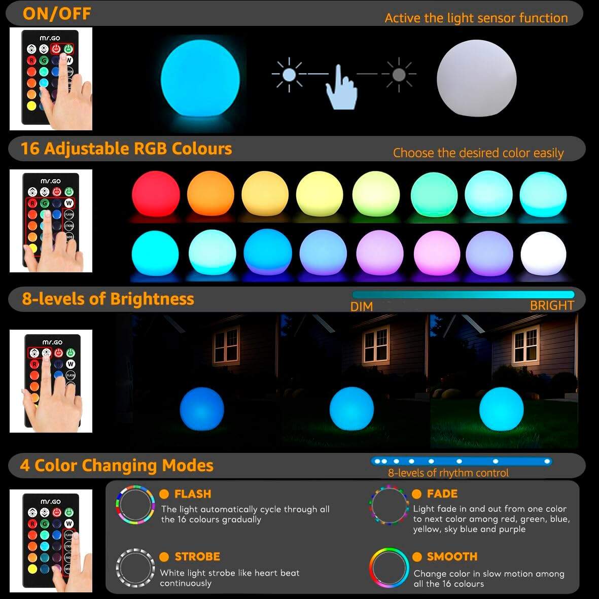 Auto On/Off: With simple press the on/off switch in the base of the sphere, this rgb light will auto turn on when it gets dark or during dusk to dawn and turn off during daytime or with enough ambient light